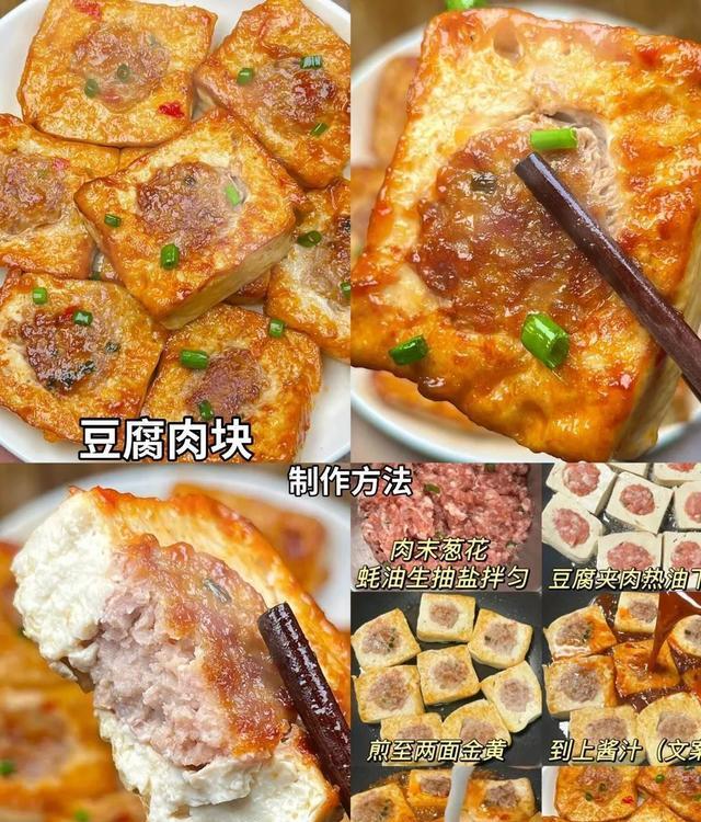 - 把豆腐切成块,然后在豆腐块中心切一个小口,然后将调味过的肉末填入豆腐中,做成豆腐肉块。