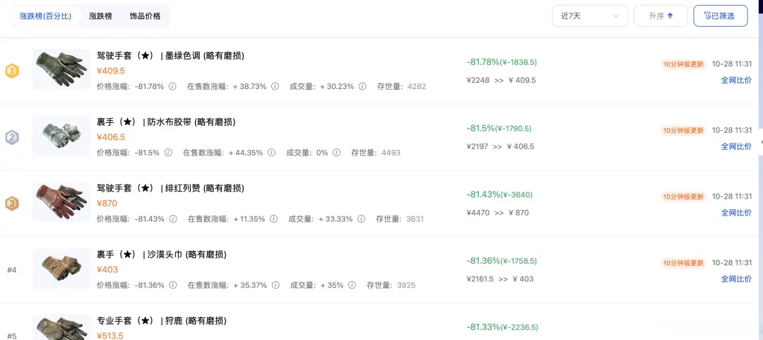 截止10月28日,近一周以高端手套、刀具为代表的稀有饰品跌幅普遍超过60%,部分热门手套道具甚至跌幅超过80%。从绝对价格看,还有多款手套一周内跌价超过2万元。