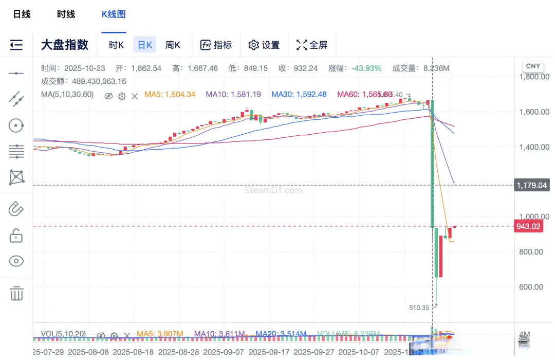 获取门槛断崖式降低,直接摧毁了高端饰品的价值基础,市场也迅速对此作出反应。据饰品数据分析平台SteamDT,10月23日当天,饰品市场大盘指数由1662点直线跳水至943点,单日跌幅约44%,10月24日继续大跌30%。