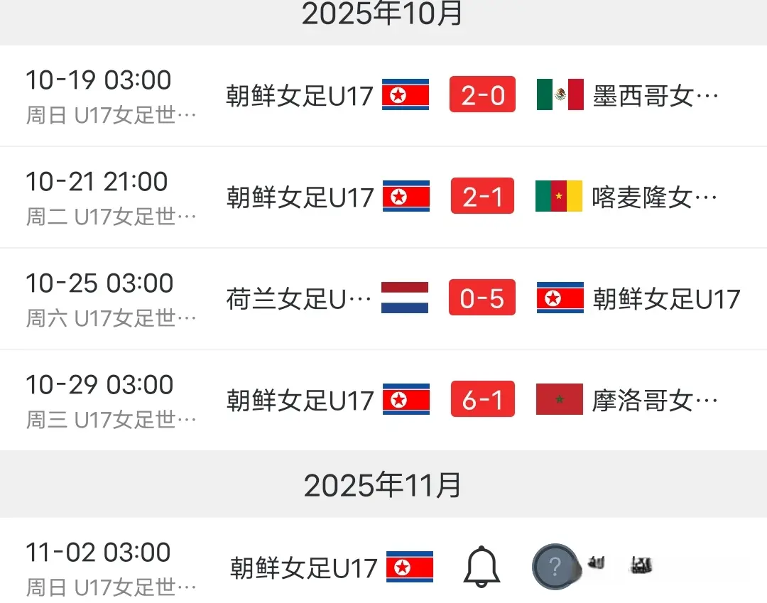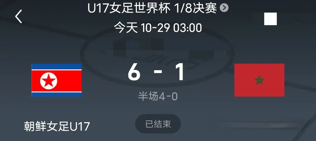 朝鲜队6-1“血洗”东道主摩洛哥队,晋级U17女足世界杯8强。这支朝鲜在本届U17女足世界杯已进行的4场比赛,表现的相当出众。小组赛首轮朝鲜队2比0战胜中北美洲冠军墨西哥队,第二轮朝鲜队2-1非洲劲旅喀麦隆队。第三轮朝鲜队5-0狂胜欧洲劲旅荷兰队。1/8淘汰赛又大胜摩洛哥队。朝鲜队从小组赛到1/8淘汰赛保持4场连胜成绩,并且朝鲜队在这4场比赛轰入15球,在亚洲4支球队参加U17女足世界杯之中,也只有朝鲜队到现在为止还保持全胜成绩。这支朝鲜队拥有夺得U17女足世界杯冠军实力,这支球队不愧亚洲足球之光!