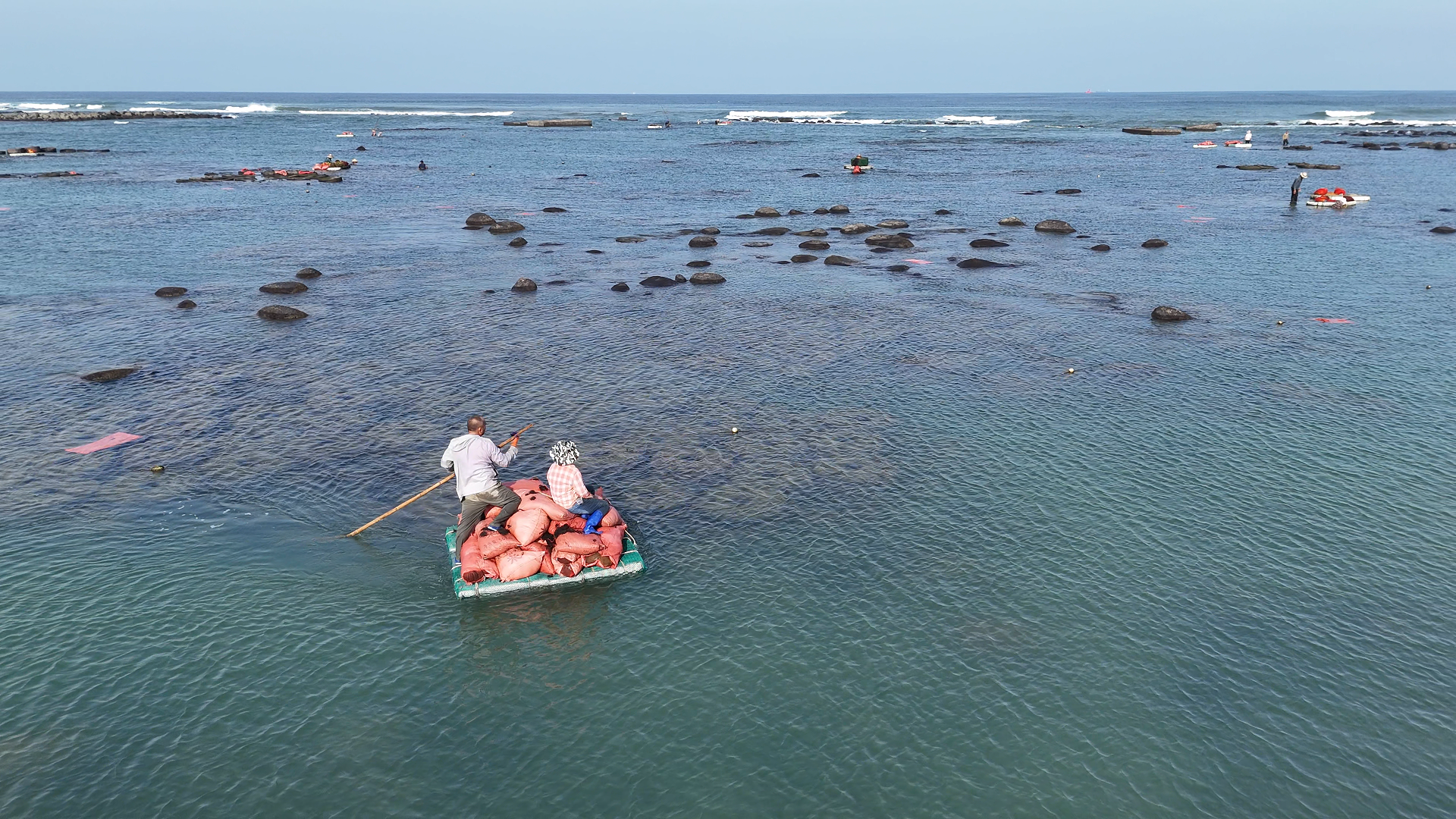 在这片不稳定的小舟上,大家或半蹲或半跪,努力保持着身体的平衡,一位经验老到的养殖户则在前方牵引着绳索,犹如一位熟练的舵手,一步步带领我们驶向海中央的养殖区域。远处,潮水轻轻拍打着礁石,仿佛在诉说着这片海域与鲍鱼之间的不解之缘。