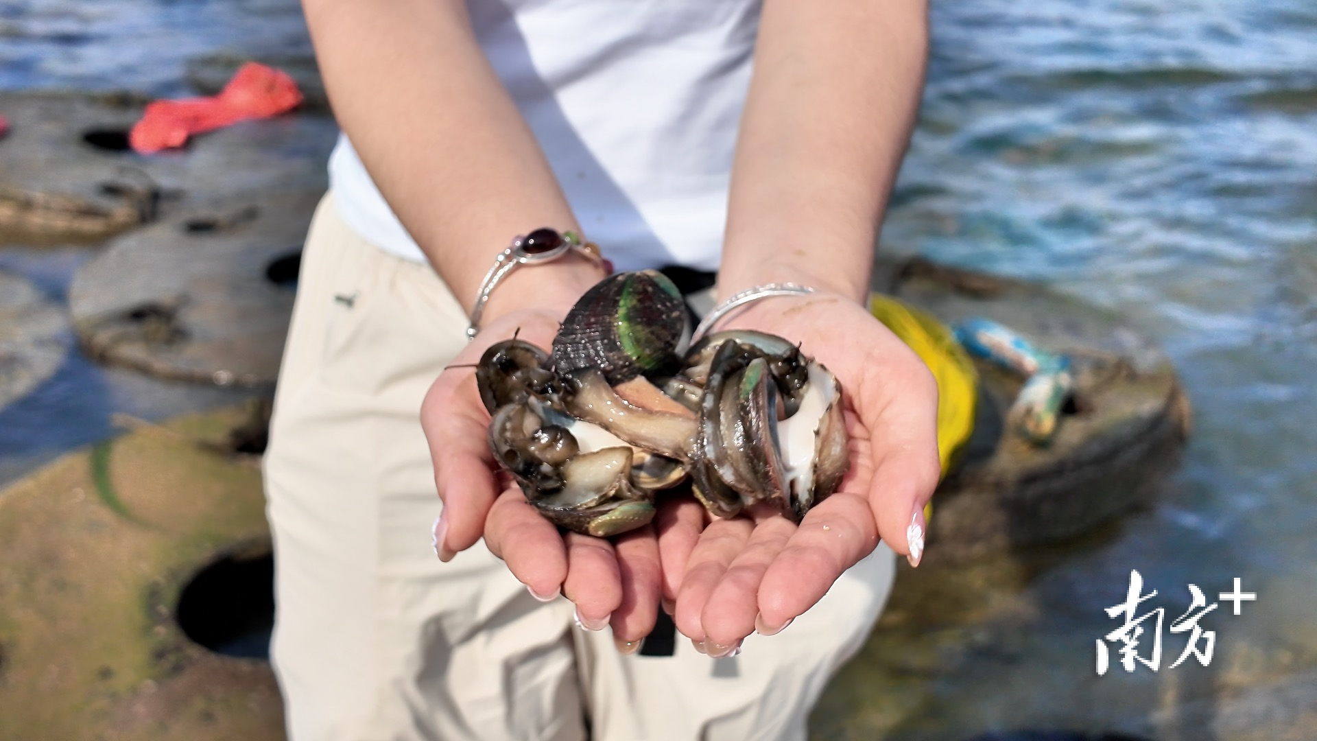 说罢,他随手从笼中捞起一块附着鲍鱼的大石,鲍鱼个头不大,却吸附得十分牢固,需稍稍用力才能“摘下”。新鲜的硇洲鲍鱼在掌心微微蠕动,触感韧劲十足,生机勃勃。