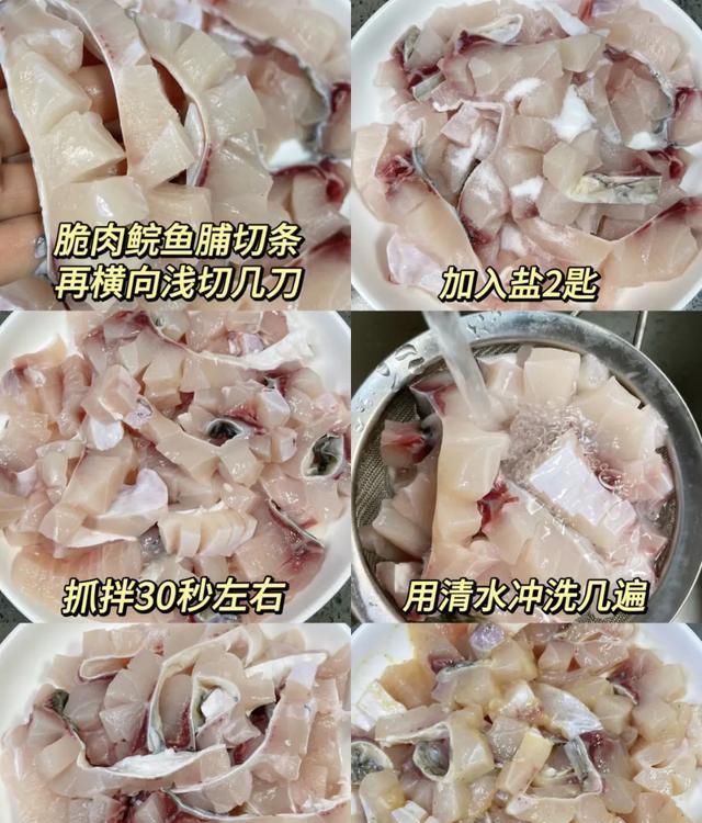 做法:1、脆肉鲩鱼脯切条,再横向浅切几刀,加入盐2匙,抓拌30秒左右