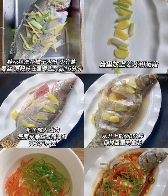 1、桂花鱼洗净擦干水份,少许盐姜丝,葱段抹在鱼身上腌制15分钟2、盘里放上姜片和葱段,把鱼放入盘内,把原来姜丝葱段拿掉,再放几片姜