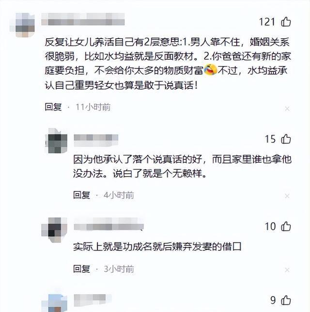 不过对于水均益的“叮嘱”,有网友认为其中包含两层含义,一层是他从自己的经历中,看出婚姻关系很脆弱,另一个便是表示自己还有其他负担,能托举水亦诗的地方有限。