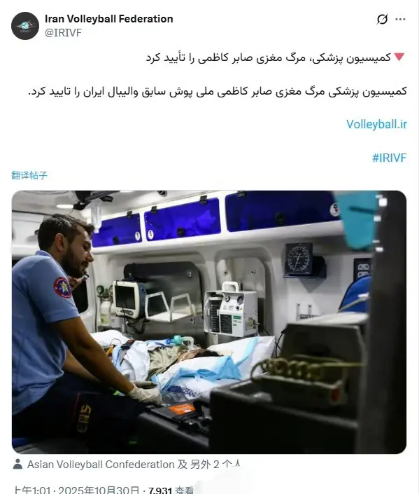 本以为他可以度过这次的难关,结果在北京时间10月30日的凌晨,伊朗排协突然发布了一条让人悲痛的消息。这位国手经过医学委员会的确认,目前已经是脑死亡的状态,这也意味着他的生命进入了倒计时,毕竟脑死亡的话需要通过机器去维持生命,这样做也没有任何意义,他醒来的可能性已经不大。这对于伊朗排协来说,必然是很大的损失,26岁对于一个运动员来说,正是打比赛的黄金年龄,如今却因为一场意外导致这样一个多方不愿意看到的结果。