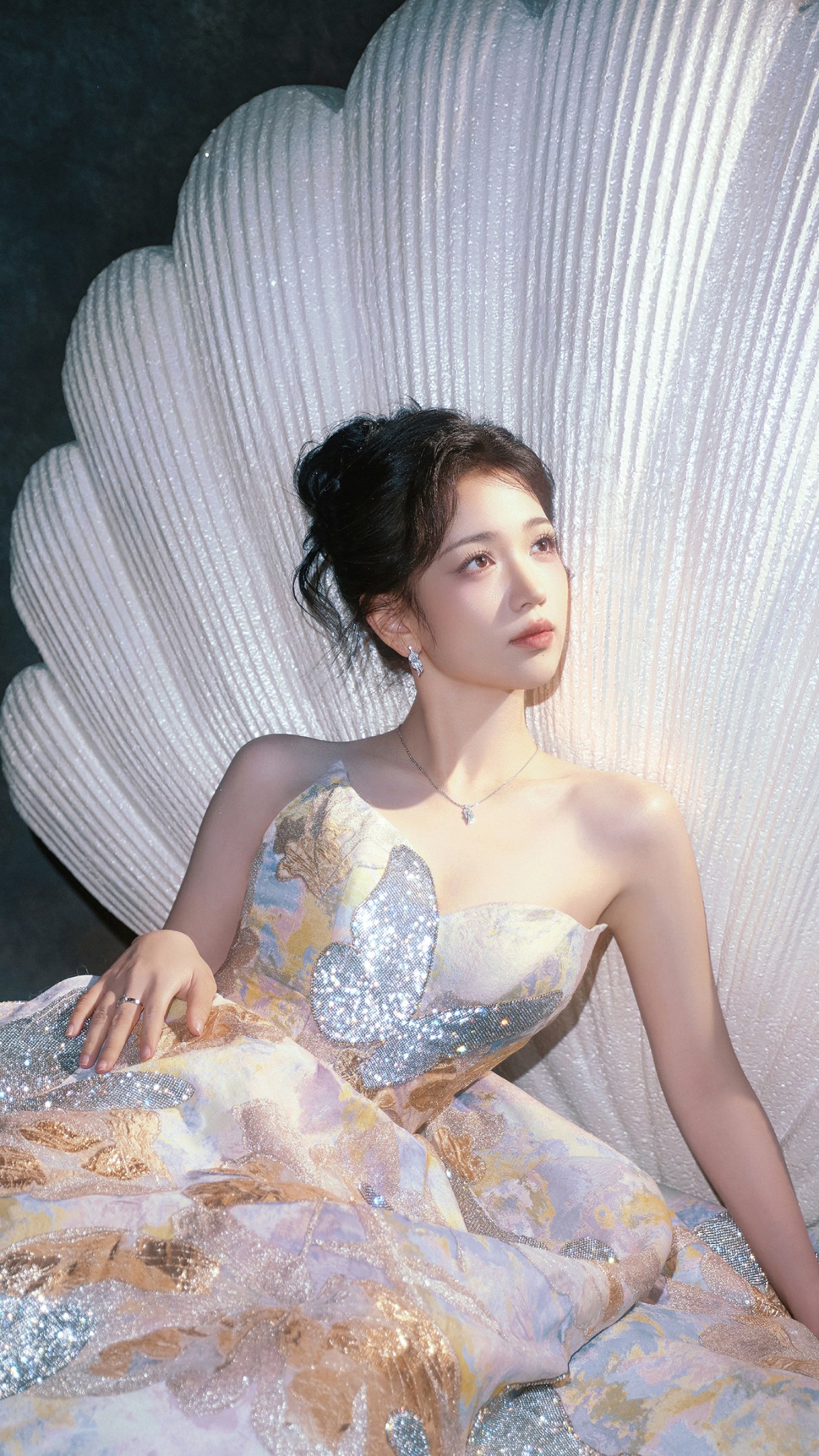 露肩剪裁设计,大胆又优雅,以雾霭紫、水波蓝与柔光金三色交织出渐变油画质感,如同梦幻的海洋画卷在肩头与腰间徐徐展开。肩部与腰间点缀的水晶镶嵌银色蝴蝶装饰,更是点睛之笔,为整体造型增添了灵动飘逸之感,仿佛蝴蝶随时会振翅飞舞。