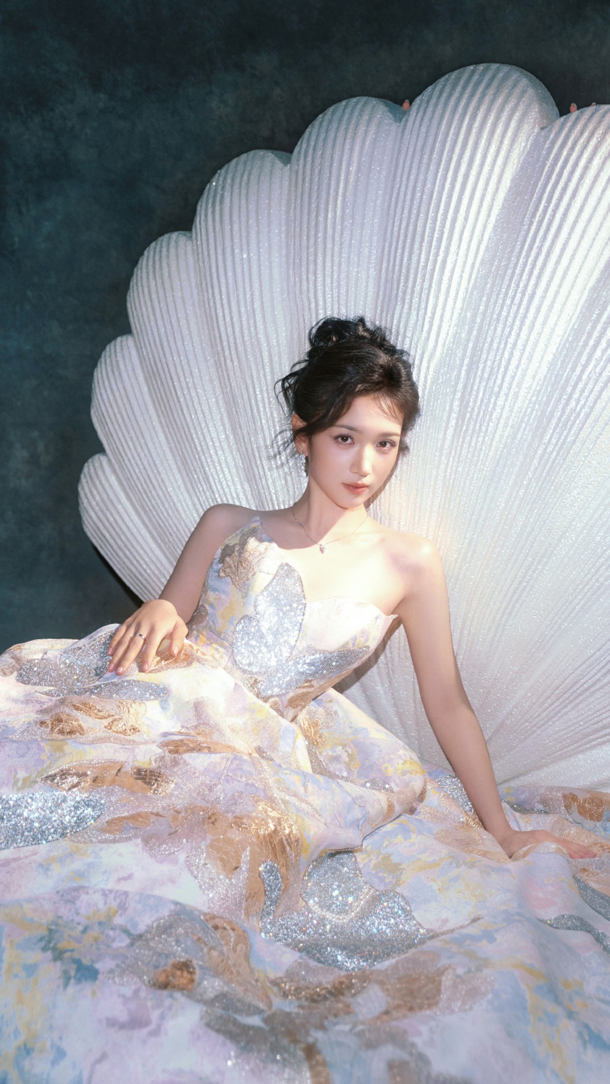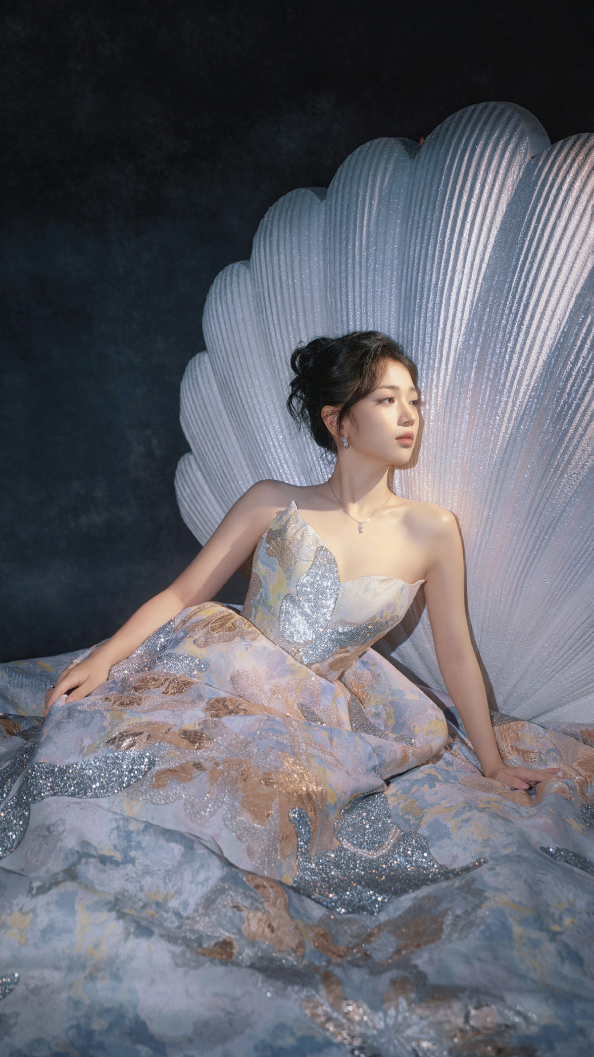 在时尚的璀璨星河中,代露娃身着的蝴蝶海螺礼服宛如一颗耀眼新星,瞬间抓住众人目光。这件高定礼服以海洋元素为灵感源泉,将蝴蝶与海螺的造型细节精妙融合,碰撞出梦幻又独特的时尚火花。礼服以银色为主色调,恰似波光粼粼的海面,在灯光下闪耀着迷人的光泽与立体感。蝴蝶翅膀与海螺纹理的立体装饰,巧妙营造出海洋生物与自然灵动的融合意象,仿佛将神秘的海底世界与轻盈的蝴蝶之舞一同穿在了身上。
