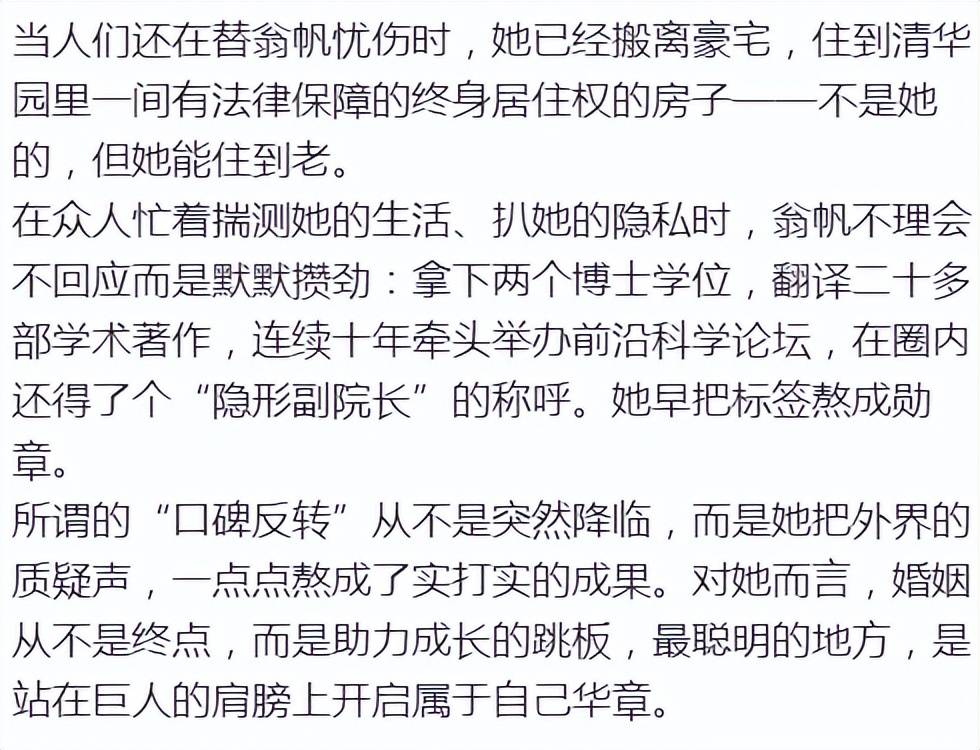 只不过,和杨振宁在一起,真的是达到了一个新的人生高度,享受没有压力的生活。没有夫妻吵架,老头有房有钱有地位有能力护着她。不担心没钱养老,不用上班生闲气。