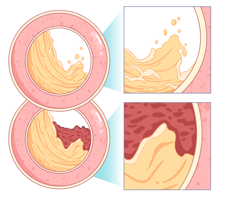 而在一些诱因刺激下,这些不稳定的斑块可能会破裂,身体会误以为血管破了要止血,便会迅速在破口处形成血栓,此时最易把血管完全堵死。