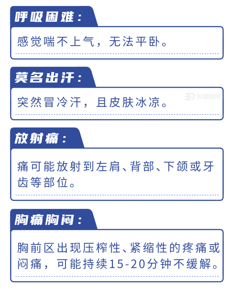 除了避免诱因,识别心梗的“求救信号”同样重要。如果出现以下情况,尤其是在夜间或休息时,应立即拨打120急救电话,千万别硬抗!