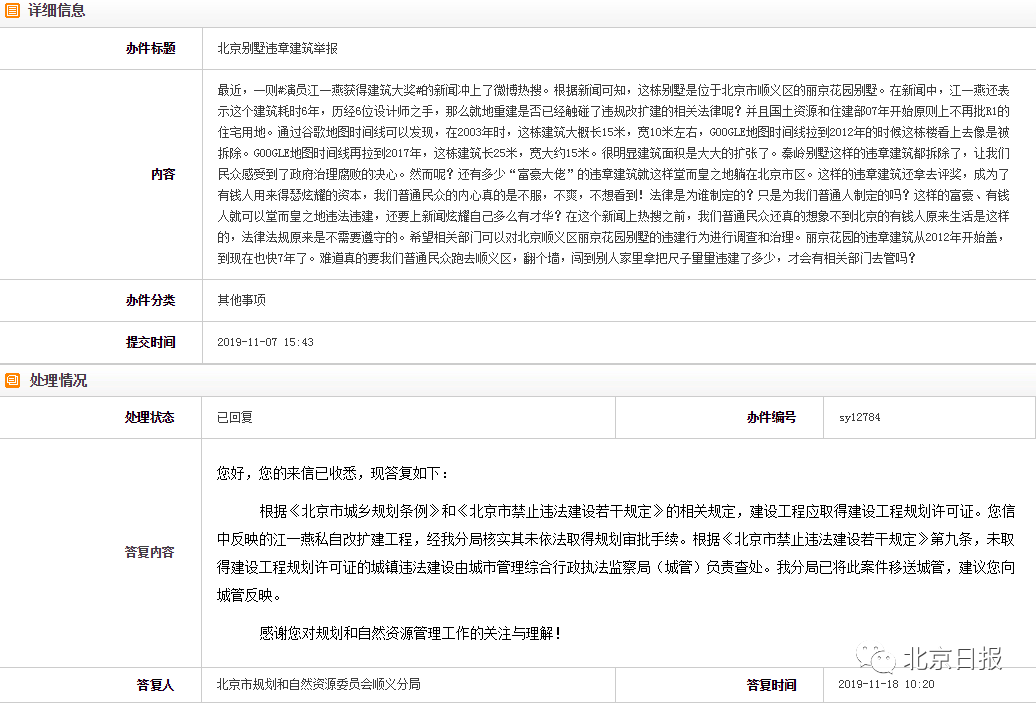 据北京日报2019年11月报道,“演员江一燕获得建筑大奖”的新闻冲上了微博热搜。有“眼尖”的网友认出,这栋别墅位于北京市顺义区的丽京花园,通过网络地图发现,该别墅存在就地重建的行为,怀疑其属于违章建筑,并向相关部门发起举报。