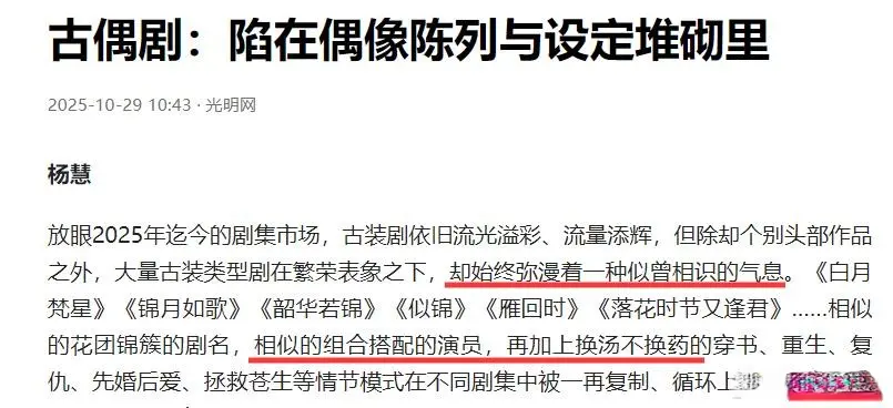 你说现在这古偶剧,看着热闹,其实早就变味了。观众嘴上不说,心里早就不满了,偏偏粉丝围起来护主,谁敢吐槽谁就被骂。直到官媒一篇文捅出来,大家才觉得,总算有人敢把那层窗户纸戳破了。