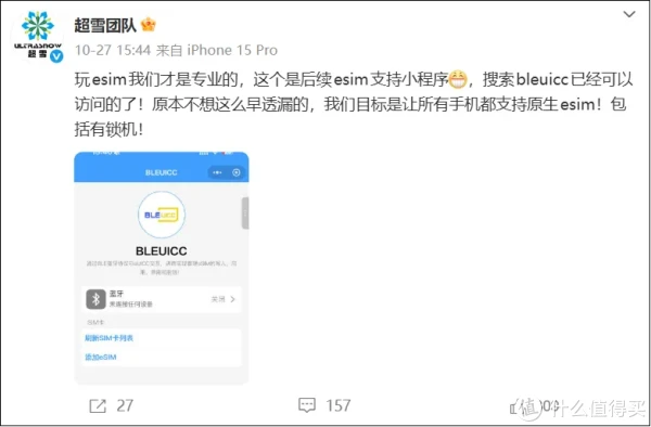 而此时低调超雪团队做不住了,其实在卡贴机eSIM方面,超雪的技术储备深不可测,早期的物联网卡eSIM,一元1个G流量还是非常不错,目前超雪表示“玩esim我们才是专业的,这个是后续esim支持小程序,搜索bleuicc已经可以访问的了!原本不想这么早透漏的,我们目标是让所有手机都支持原生esim!包括有锁机!”