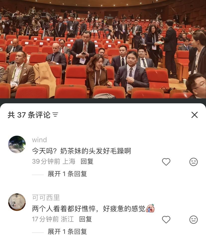 其实这场会议中,很多人都在窃窃私语,或者私下里商量着什么。而章泽天和刘强东的交流就非常好,刘强东气场很强、但是表情相对凝重。