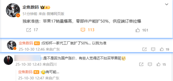 【CNMO科技消息】10月30日,数码博主爆料称,iPhone 17标准版上市后销量非常高,零部件产能扩张50%,供应端订单已经供不应求。有网友猜测,iPhone 17标准版的热销原因之一就是国产旗舰手机纷纷涨价的原因导致。该博主表示的确有这种可能。