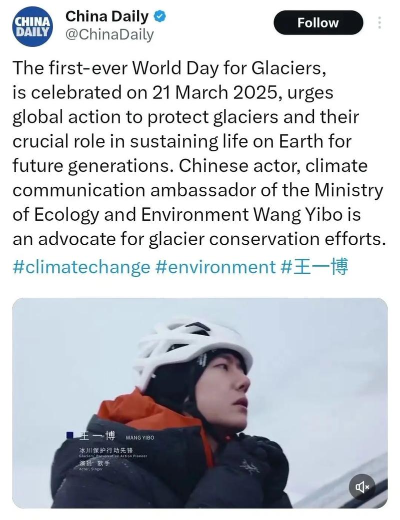 2025 年 2 月,王一博以联合国气候传播大使身份,跟随生态环境部前往西藏的仁龙巴冰川,参与国际冰川宣传片拍摄。