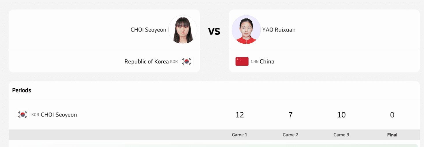 姚睿轩3-0崔瑞妍【14-12,11-7,12-10】 ;