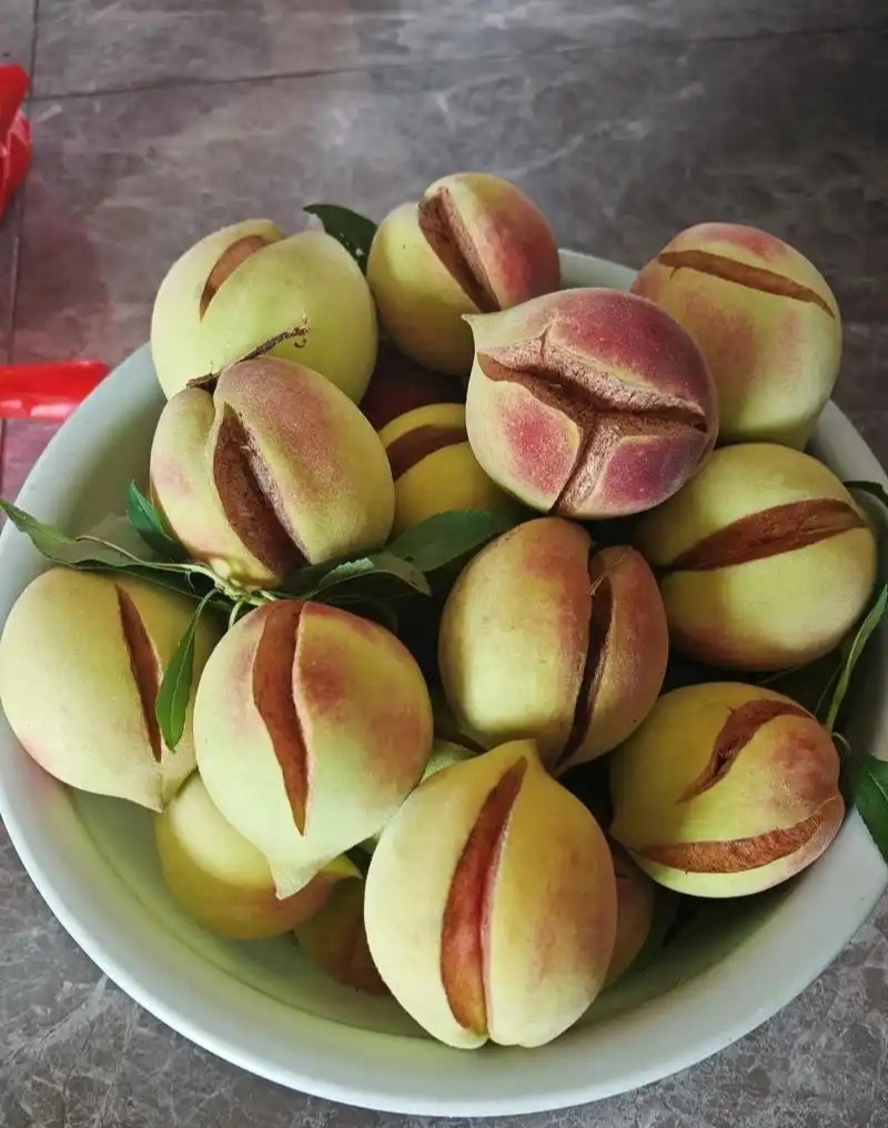 原来正常桃子成熟时只会轻微裂果,这种裂得大口子的,要么是浇水太多、要么是病虫害导致的。