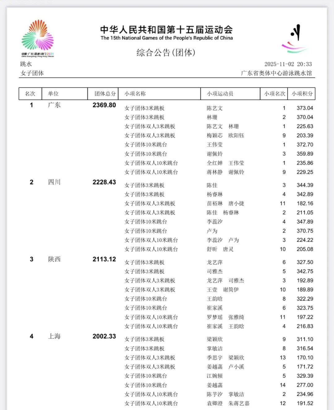 最终广东队总分排名第一,夺得跳水女子团体项目冠军。