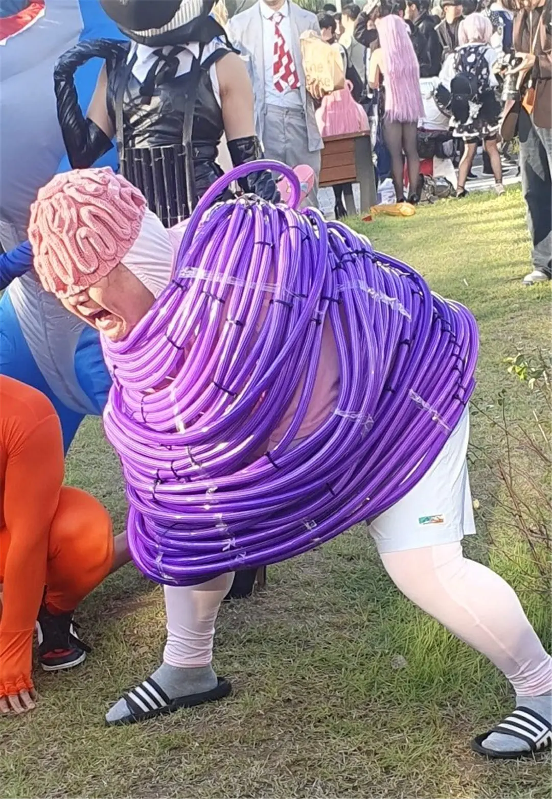 这么一个玩意,居然有人想Cos,最后还真的被还原了出来!想必你和博士一样,都没有想到。哥们不知道从哪里弄来了一顶相似的帽子,然后在身上缠上管子,整个造型居然和台风恶魔非常相似!这让我们想到了那个有名的泰国低成本小哥“Lowcostcosplay”,两人的思路差不多,就是用一些随处可见的道具加上天马行空的创意来还原角色,让人拍案叫绝!