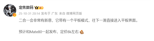 快科技11月3日消息,据博主定焦数码爆料,华为新款二合一平板即将登场,会与Mate 80系列同台发布,定价预计在8000元左右。