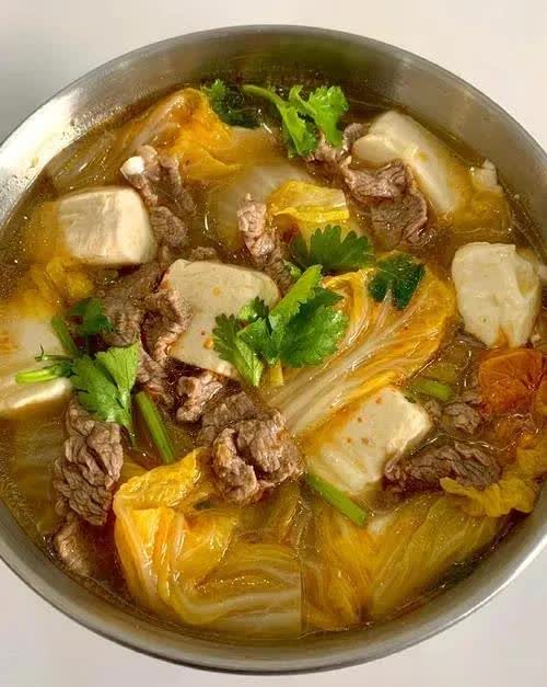 3、接着把白菜放入煮熟,再加入腌制好的牛肉煮一分钟左右。