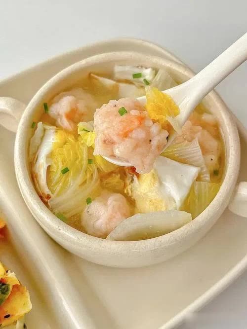 3、再将虾滑揉成丸子放入汤中继续煮一分钟,然后加入娃娃菜一起煮熟。