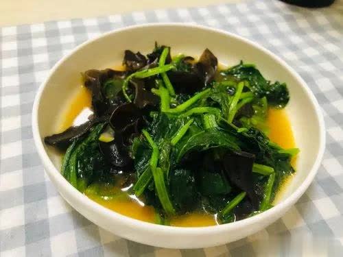 3、油热放青红椒蒜片爆香,放入木耳翻炒至断生,放入菠菜翻炒均匀,加入适量盐和生抽翻炒均匀即可。