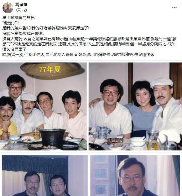 在许绍雄离世后,冯淬帆发出的悼文充斥着无奈与预感应验的悲伤。他当时写道:“实在不敢相信你竟然走在我前面!”并透露自己已“病入膏肓,苟延残喘”。