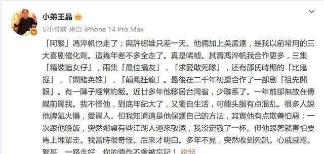 然而,在冯淬帆离世后,王晶的态度明显软化。他在2025年11月1日的悼念中表示:“一年前无故骂我,我不怪他,到底年纪大了,又独自生活,可能头脑有点混乱。”
