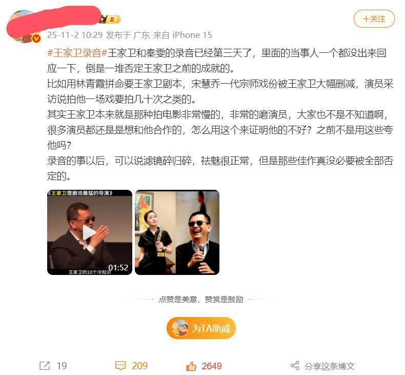 就在大家等着说法的时候,有微博博主突然站出来帮王家卫说话,字里行间都透着 “洗白” 的意思。