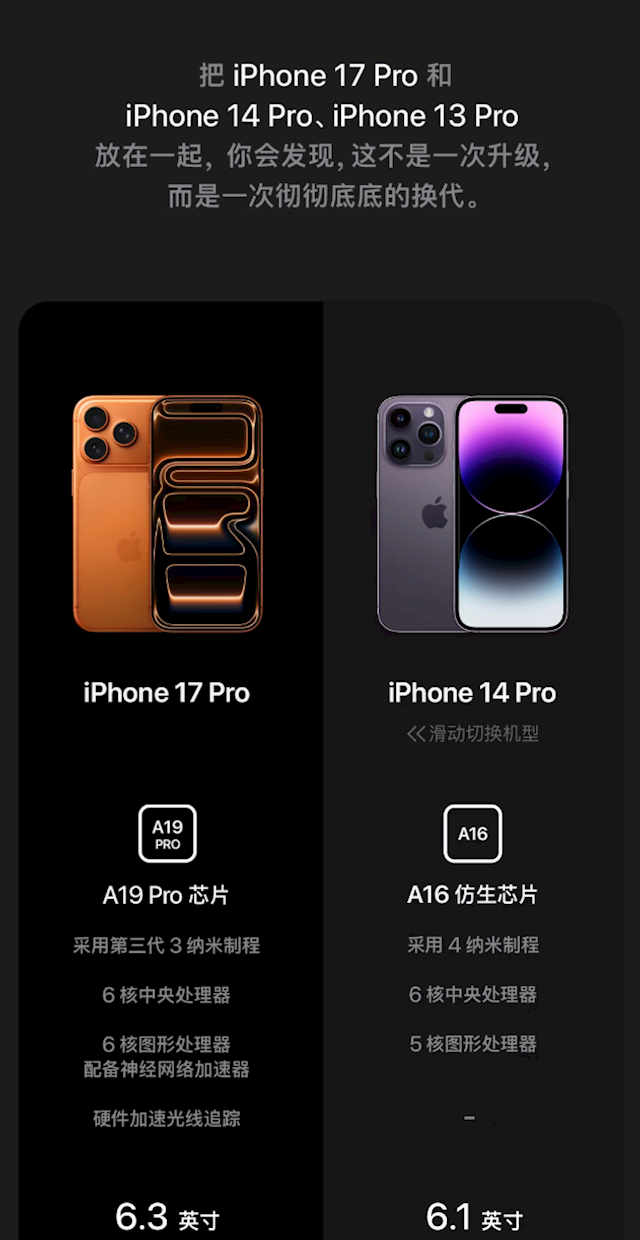 苹果表示,将iPhone 17 Pro与前两代机型放在一起,会发现这不是一次升级,而是一次彻彻底底的换代。