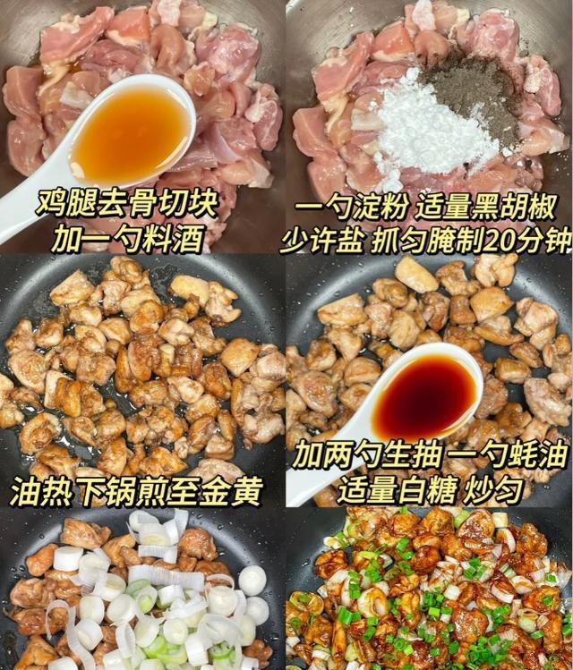老妈说上周去一个开饭店的朋友家吃饭,被这个做法惊艳到了,马上跟朋友要了配方来。今天正好试试,做法可简单了,鸡肉煎一煎,加点调料煮一煮,最后放把葱。一口咬下去,鸡肉鲜嫩多汁,葱香四溢。