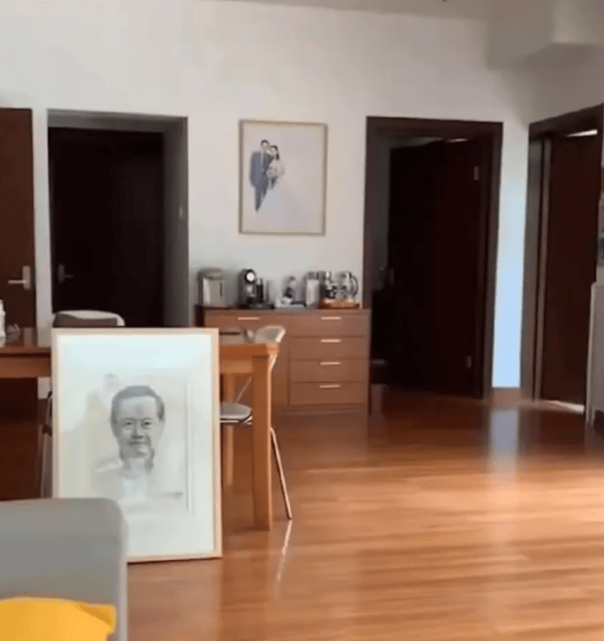 别墅正中间和杨老的结婚照是最显眼的,还有杨振宁的画像,地板干干净净的,其他的杂物衣服什么的估计都搬走了吧,略微显得有些空旷
