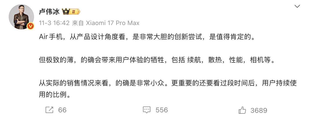 此前,有消息称小米在规划超薄手机,但基于目前的市场表现,似乎也放缓了这一计划。小米集团总裁卢伟冰指出,“Air手机,从产品设计角度看,是非常大胆的创新尝试,是值得肯定的。但极致的薄,的确会带来用户体验的牺牲,包括 续航,散热,性能,相机等。从实际的销售情况来看,的确是非常小众。更重要的还要看过段时间后,用户持续使用的比例。”