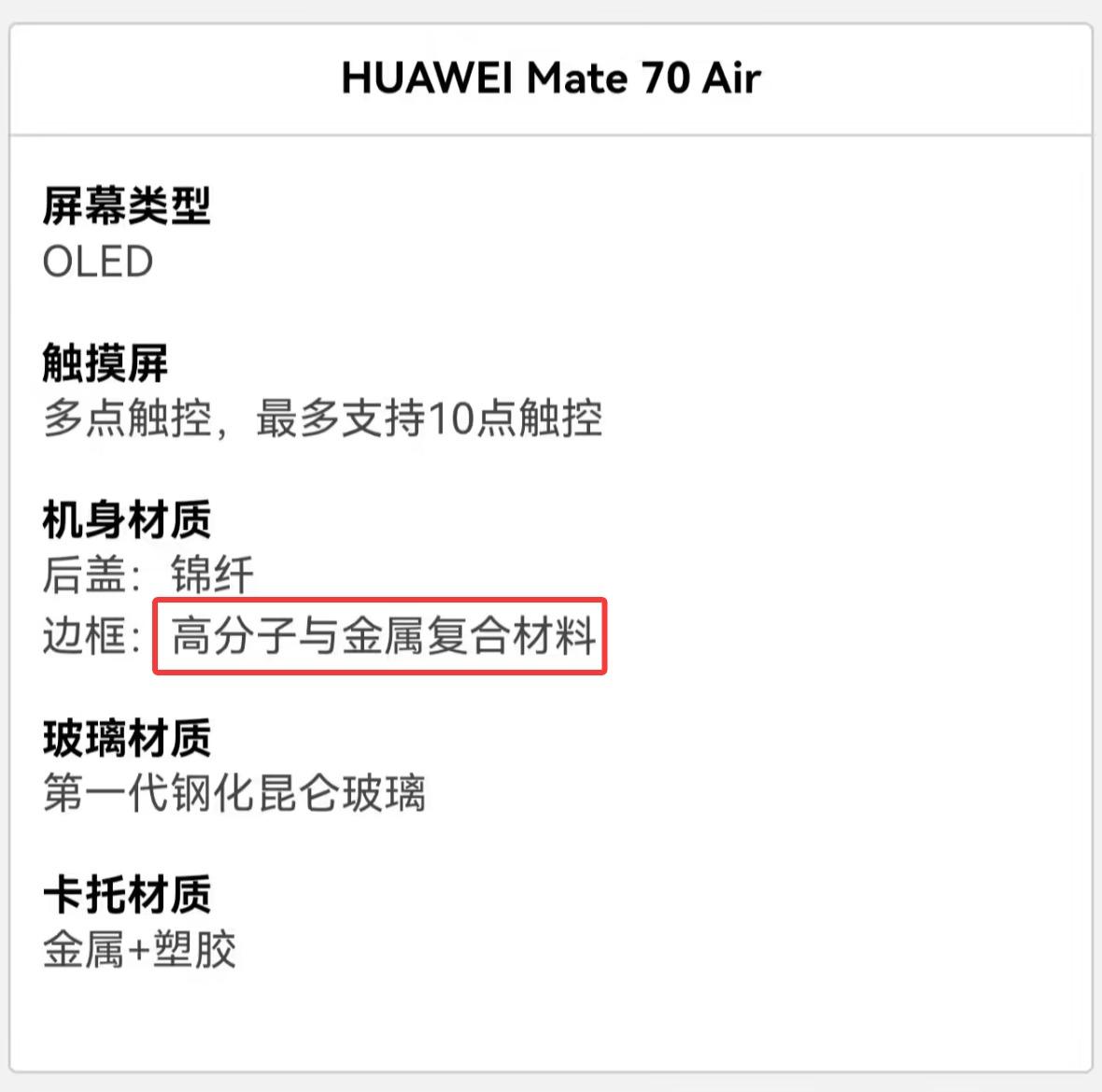 另一方面,在华为官网的“HUAWEI Mate 70 Air常见配置及功能参数说明”页面,也针对该手机的中框材质问题做出解答,相关内容如下: