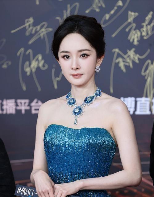 图片中,杨幂穿着米色抹胸长裙,戴着满是钻石的项链,让整个人看起来优雅无比。