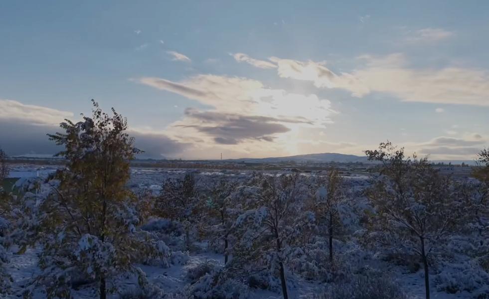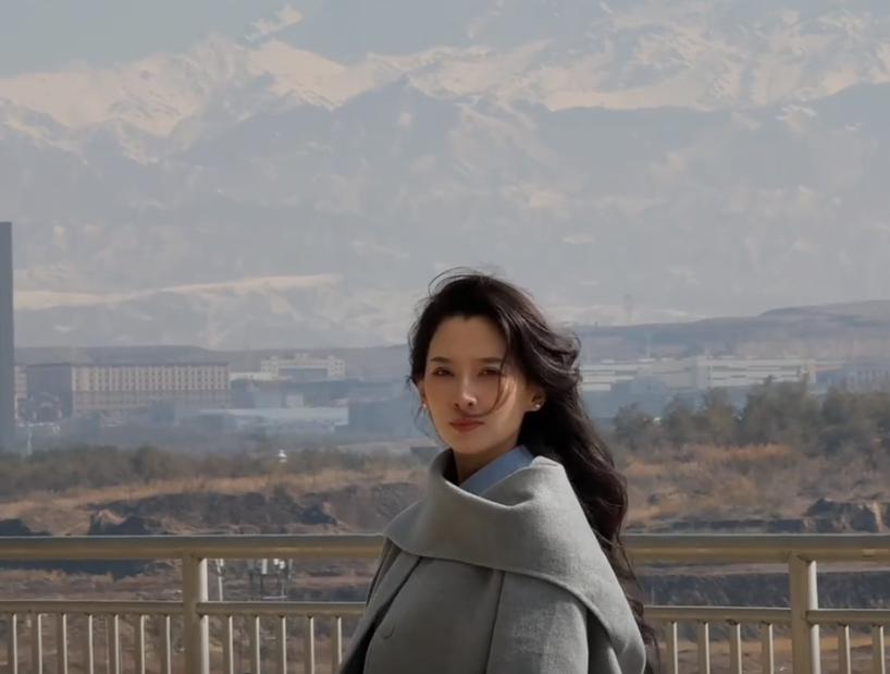 视频中的他站在雪山前,微风拂过她的秀发,也不知道什么原因,她的头发看起来有点偏棕色,而且还有点自来卷的样子,