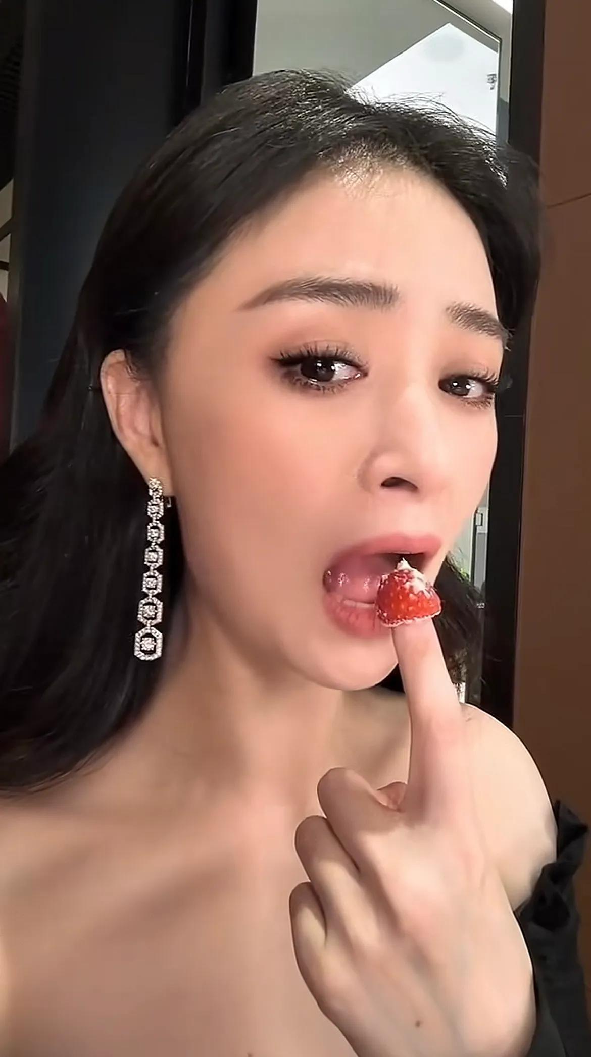 结果,只能吃顶部点缀的水果,外表稍微蹭了一点点奶油,都让蒋欣吃得小心翼翼,异常满足。