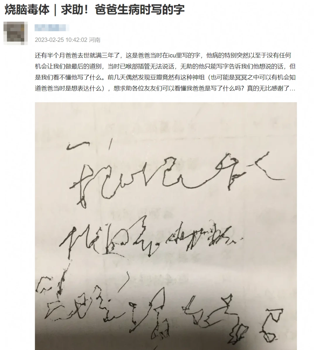 例如在2023年5月的时候,有人在“烂字小组”里发帖求助,请求辨认自己奶奶离世前写的文字。