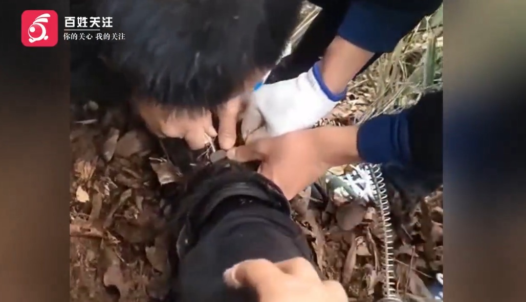11月5日重庆奉节县村民上山采菌误踩捕兽套,同行人员协助脱险。