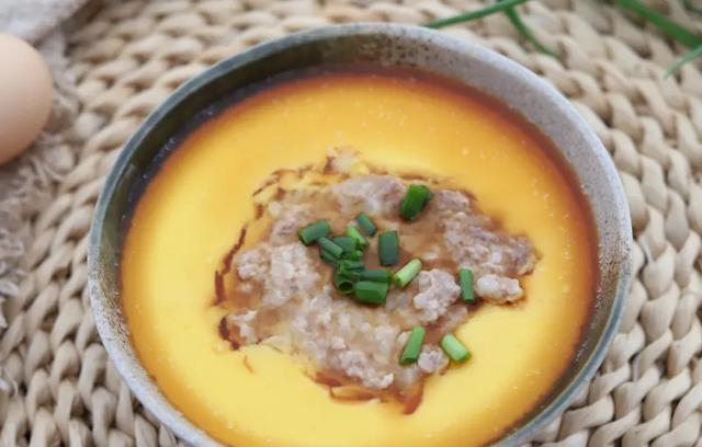 3、猪肉洗干净剁成肉末,加入适量食盐、生抽、料酒、胡椒粉、食用油,搅拌均匀备用。鸡蛋羹蒸到6分钟时,已经定型了,把肉末团成丸子,压成薄饼,铺在鸡蛋表面,盖上盖子继续蒸4分钟就行了,把鸡蛋羹取出来,淋上生抽、香油,撒上葱花即可。