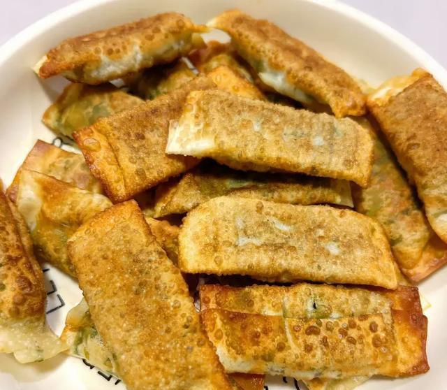 2、把鸡蛋块倒入韭菜中,加入适量食盐、蚝油、五香粉、香油,用筷子搅拌均匀。用馄饨皮包入韭菜鸡蛋馅,捏成锅贴。平底锅放油烧热,下入锅贴小火煎至颜色金黄,即可出锅。