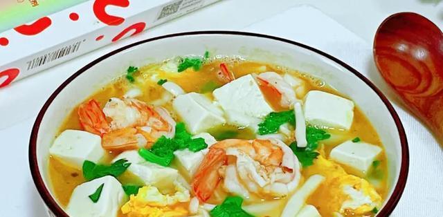 2、锅里留底油,放入葱花爆香,倒入腌好的虾仁翻炒至变色,倒入开水后加入豆腐、白玉菇、煎好的荷包蛋,大火煮5分钟,出锅前放入适量盐、香菜即可,味道鲜美。