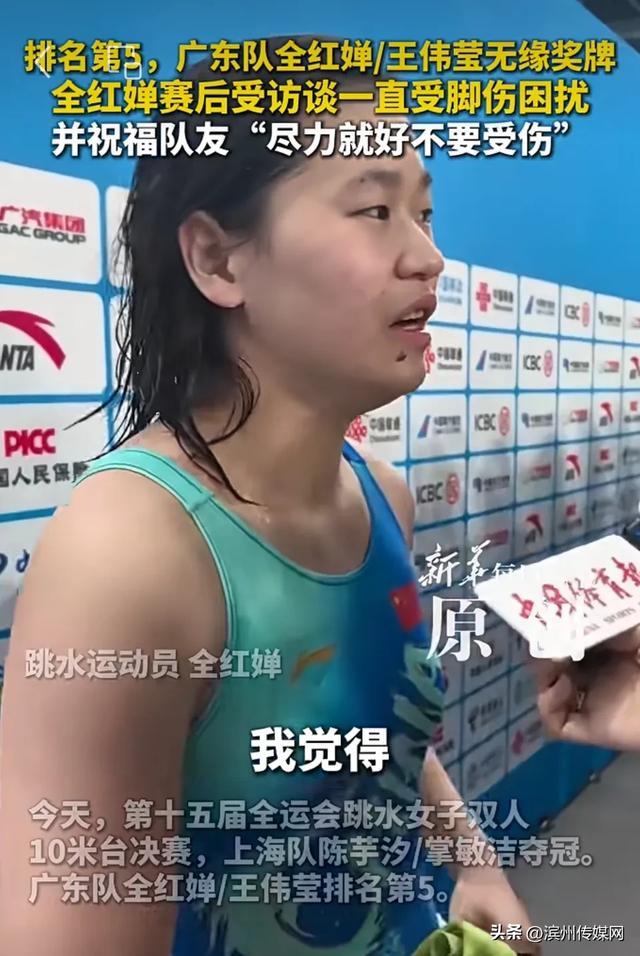 在赛后采访中,全红婵表示感谢大家关注跳水。全红婵回应称,比赛确实是没跳好,但还算正常,和王伟莹搭配不是很久,两个人都努力地想要跳好。受伤后确实对自己有影响,训练和比赛中脚会很痛。