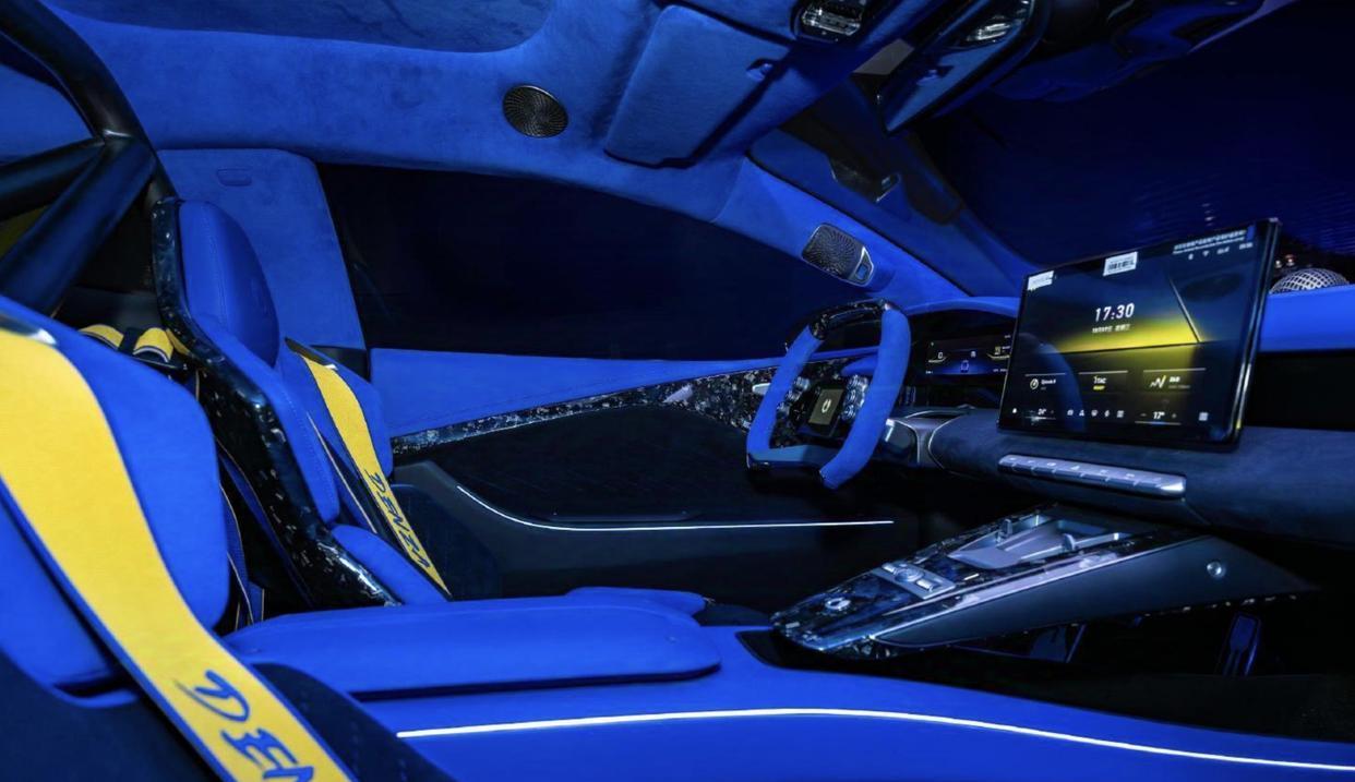 腾势Z敞篷版内饰采用了冷色调为主的配色方案,大面积蓝色Alcantara麂皮材质和碳纤维材质的交替铺陈,再加上蓝色高级复合面料和黄色的菱形缝线,多色的拼接工艺,还有亮黑色钢琴烤漆饰板、哑光色碳纤维装饰面板的交替运用,再配上前排两个桶装赛车座椅和四点式安全带,营造出了更加浓郁的赛车氛围。中控台的布局与此前曝光的腾势Z量产版车型保持一致,中控台采用了类似游戏手柄样式的方向盘,两侧加入了大尺寸换挡拨片,配合着更多高阶智驾辅助,带来了更加优秀的操控体验。科技感方面,该车配备了彩色全液晶仪表、AR-HUD抬头显示系统、巨大的悬浮式中控大屏和矩形嵌入式副驾显示屏,同时还有帝瓦雷品牌高端音响。