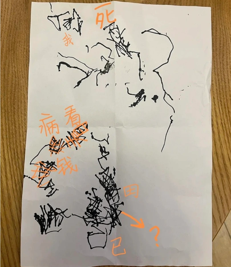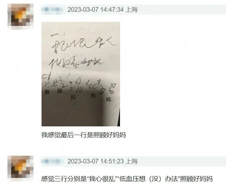 而这份由纸笔转述出来的文字,当时在“烂字小组”中吸引来了四十多层回复,最后隐隐约约地被组装成三行文字——“我心很乱”“低血压想(没)办法”“照顾好妈妈”。