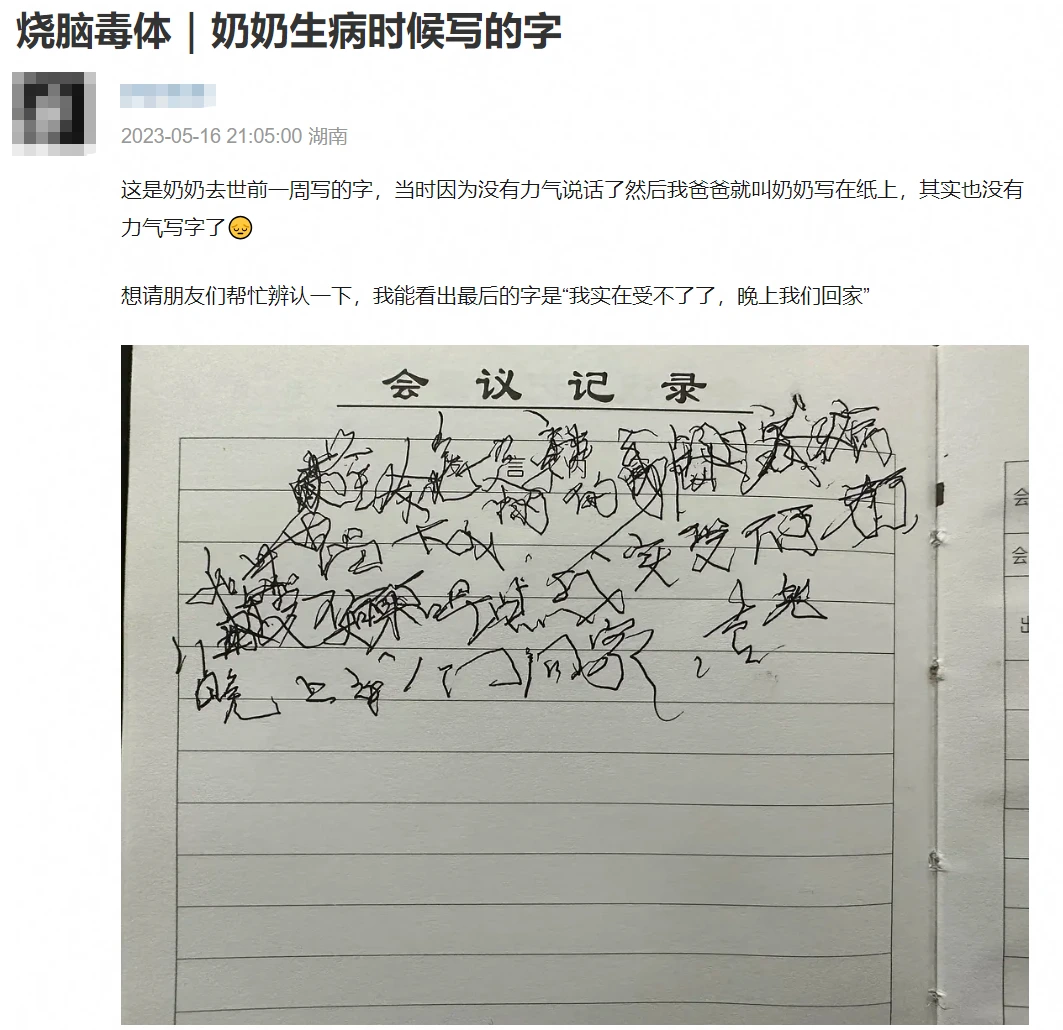例如在2023年5月的时候,有人在“烂字小组”里发帖求助,请求辨认自己奶奶离世前写的文字。
