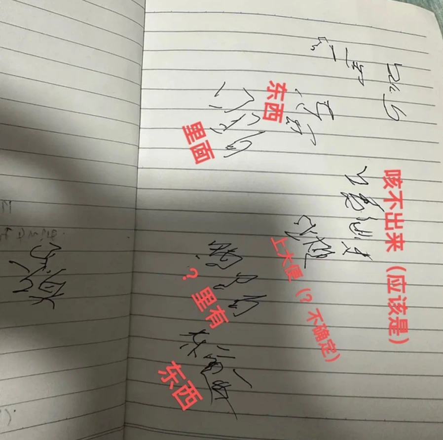 其他部分的文字,则分别被推测为“咳不出来”“上大便”。